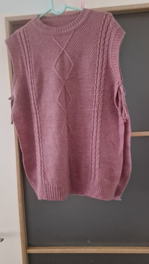 Pembe renkli, örgü dokulu kadın süveter, bohem tarzda, rahat kesim ve kolsuz tasarıma sahiptir. Günlük kullanıma uygundur.