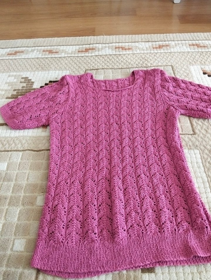 Pembe renkli, kısa kollu ve yuvarlak yaka kadın kazak. Bohem tarzda, rahat kesim ve örgü yapıya sahip, günlük kullanıma uygun.