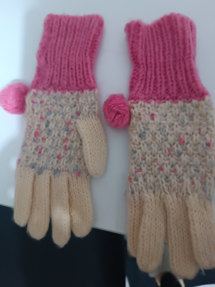 Örgü, pembe manşetli ve krem rengi, pembe detaylı bohem tarzda renkli kız eldivenleri. Yumuşak ve sıcak tutar. hiç kullanilmadi temiz