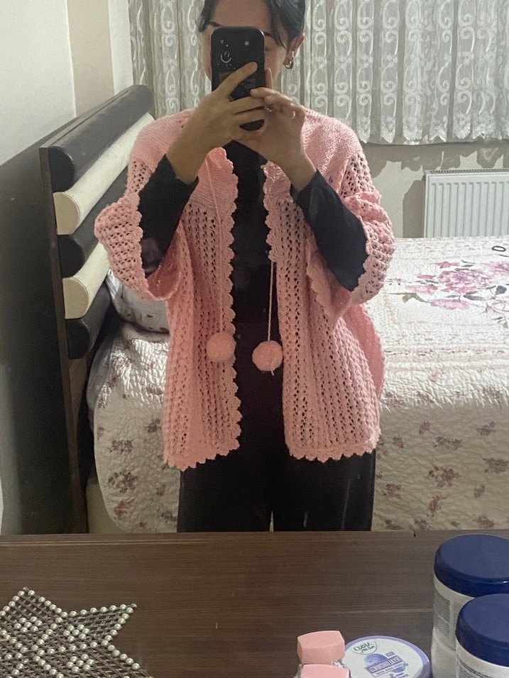 Pembe pastel renkte, uzun kollu bol kesim kız hırka. Örgü dokusu ve ponponlu bağcıklarıyla bohem tarzda.