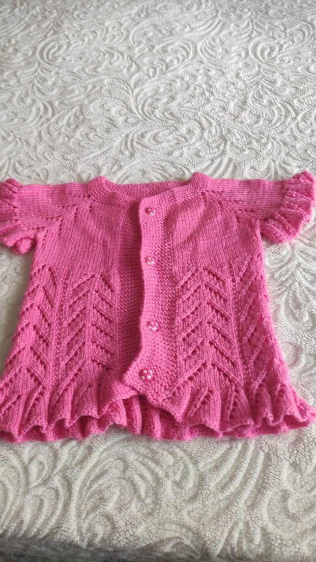 Örgü pembe kumaştan yapılmış, bohem tarzda, bol kesim, uzun kollu kız hırkası. Düğmeli ve zarif desenlidir.