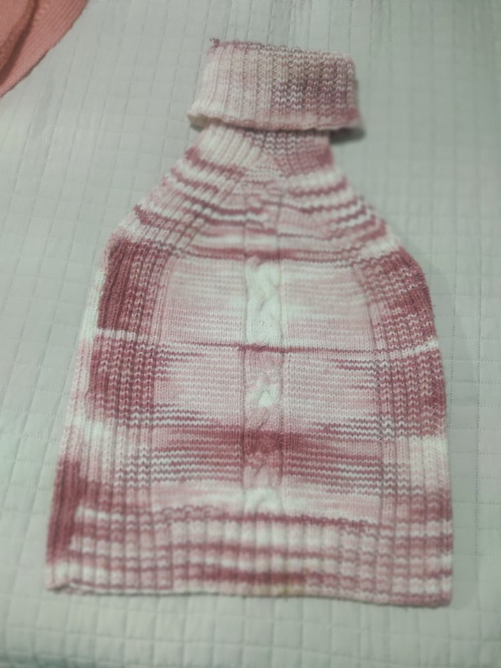 Yumuşak örgü kumaştan yapılmış, boğazlı ve kolsuz, pastel pembe tie-dye desenli, bohem tarzda, normal uzunlukta ve vücuda oturan kazak.