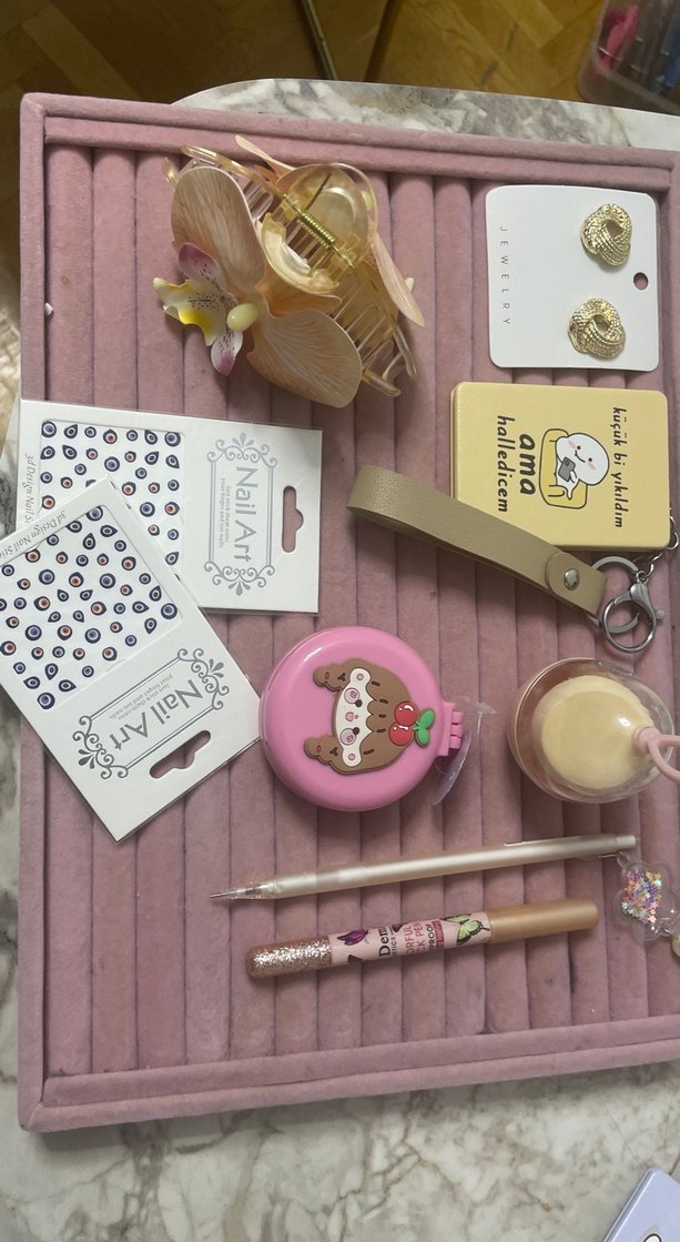 Pastel pembe bohem tarzda parlak saç tokası, baskılı tırnak süsleri, sevimli pembe mezura, bej anahtarlık, küpeler ve makyaj fırçaları içeren aksesuar seti. ✨