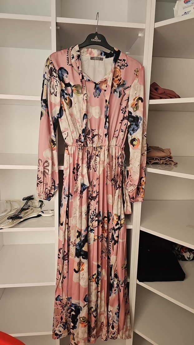 Yumuşak saten kumaştan, uzun kollu ve yüksek yakalı pembe bohem piliseli uzun elbise. Gevşek kesimi ve pastel tonlarda batik deseni bulunur.