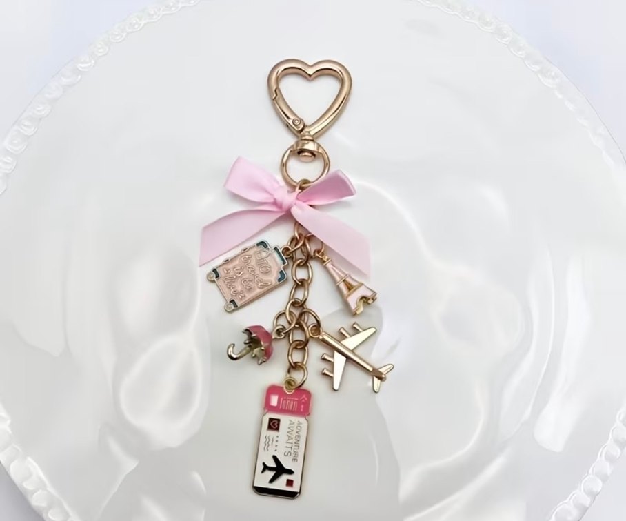 Pembe bohem tarzda kalp şeklinde toka, pastel püskül ve Eyfel Kulesi, uçak, şemsiye, seyahat bileti figürlü Paris temalı anahtarlık.
