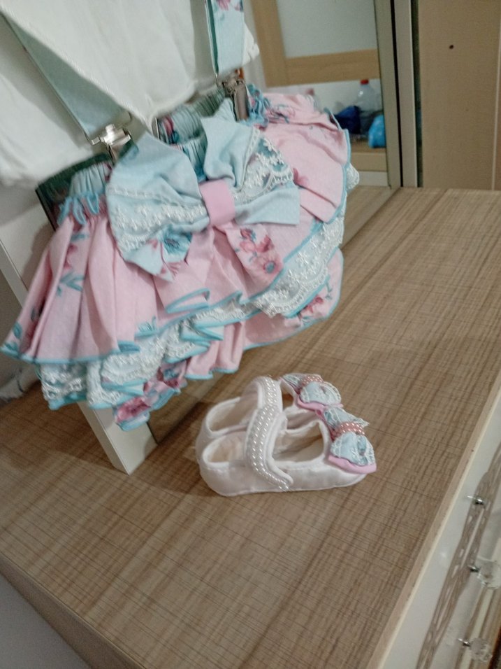 Pastel pembe bohem tarzda, fırfırlı ve batik desenli çocuk kemeri, yumuşak tekstil malzemeden, ayarlanabilir askılarla özel gün elbisesi