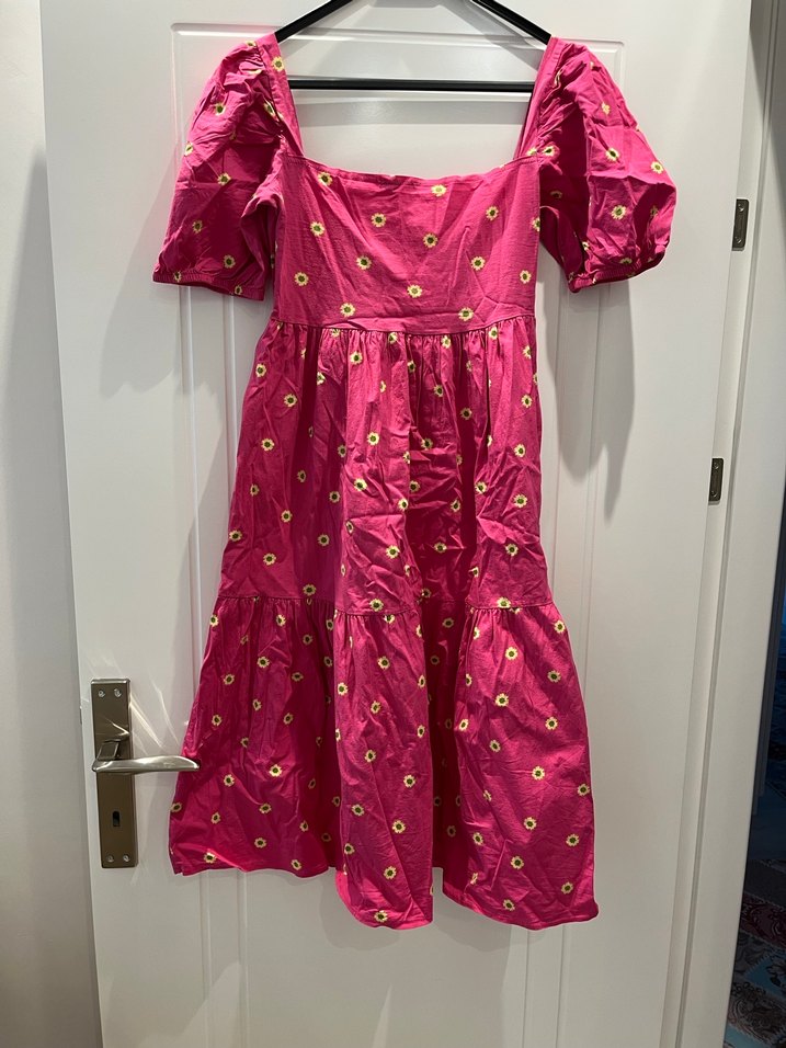 Pembe midi elbise, bol kesim, fırfırlı detaylar ve desenli. Askılı ve straplez kol tasarımıyla romantik akşamlar için uygun.