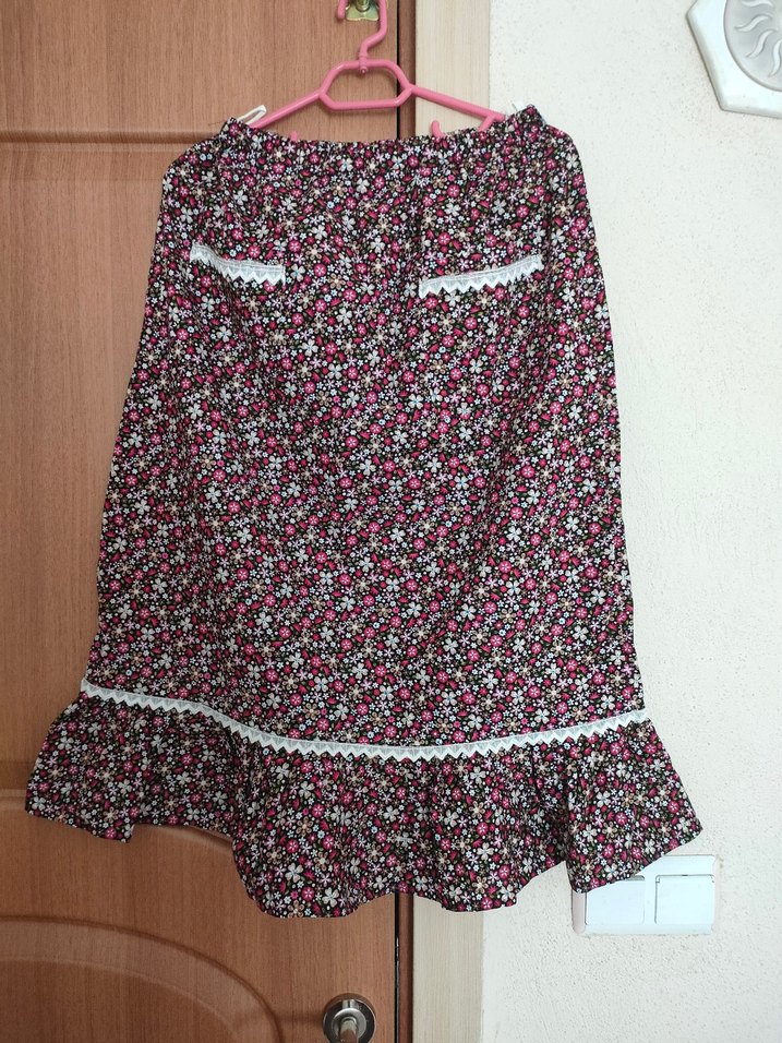 Yumuşak dokulu pembe bohem tarzı midi hamile eteği, bol kesim ve fırfırlı detaylarla günlük kullanıma uygun.