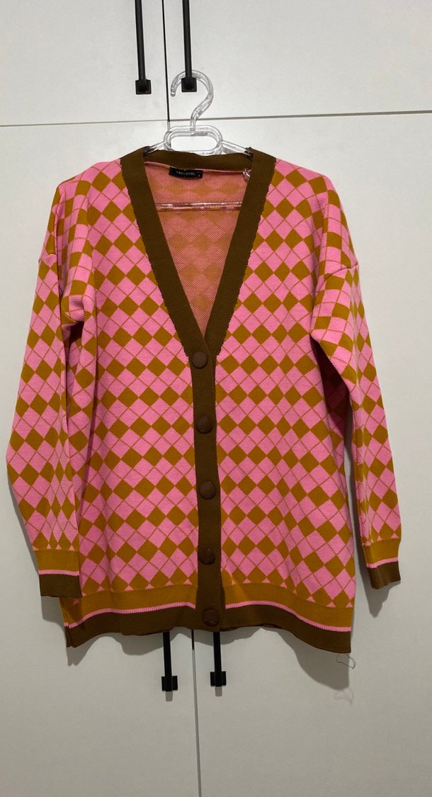 Kadınlar için uzun kollu, V yakalı, bol kesim örgü hırka. Pamuk karışımı kumaştan yapılmış, pastel pembe ve kahverengi kareli desene sahip, bohem tarzı için uygun.