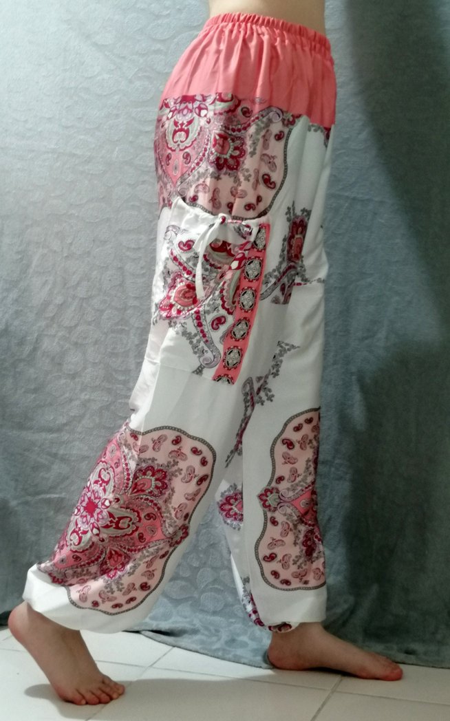 Pembe ve beyaz renklerde, salaş kesim ve drapeli, batik desenli uzun kadın pantolonu. İnce saten kumaştan, yan cepli paçalar lastikli günlük kullanıma uygun. Bel:74cm Boy:105cm