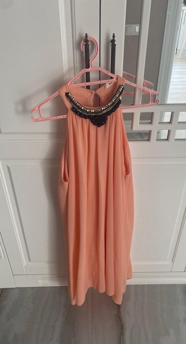 Kolsuz, yüksek yakalı pembe midi elbise, drapeli ve süslemeli detaylarla bohem tarzda, salaş kesimlidir.