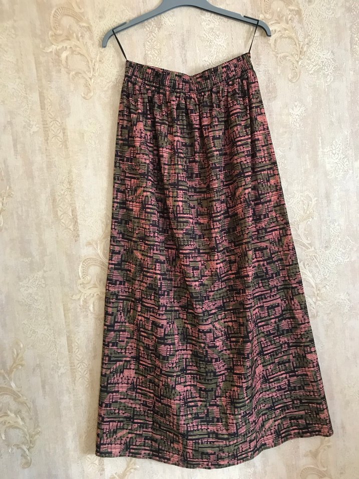 Sıfır.Pembe tonlarında bağlama desenli, salaş kesim ve astarlı uzun etek. Polyester kumaştan, günlük kullanım için uygun . 36 Beden Ama 38 rahat olur.