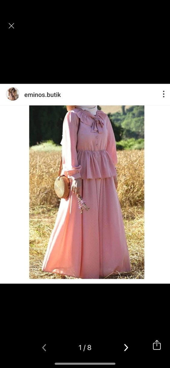 Bol kesim, uzun pembe elbise, fırfır detaylı ve yüksek yakalı. Yumuşak sentetik kumaştan, askılı kollu, mütevazı bohem tarzında.