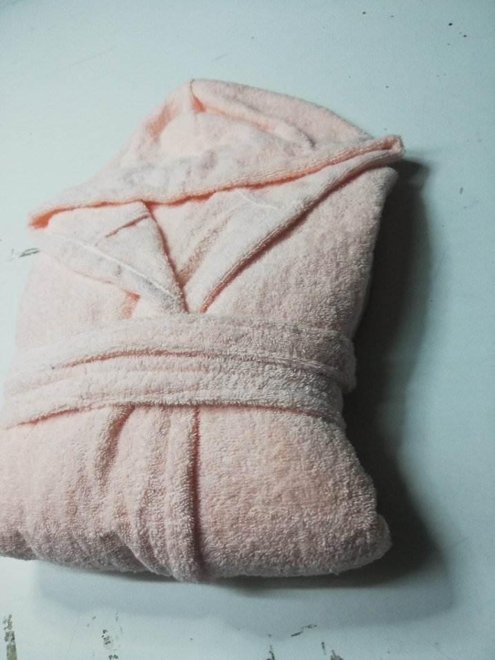 Kapüşonlu ve kuşaklı, pastel pembe renkte yumuşak dokulu, desensiz bohem tarzı bornoz. Banyo sonrası rahatlık için ideal.