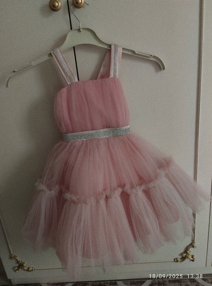 Pastel pembe, fırfırlı ve askılı yakalı, yumuşak sentetik kumaştan yapılmış, bohem tarzda dar kesim elbise. Parlak bel kemeri bulunur. 6 8 yaş arası olur