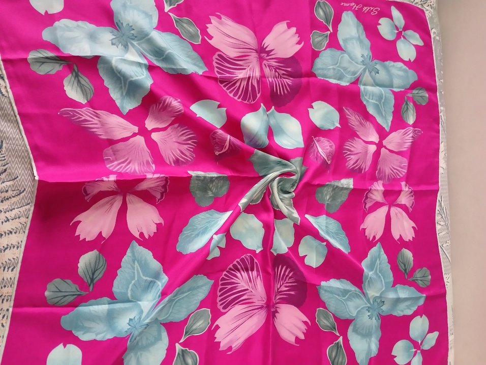 Canlı pembe renkte, ipeksi dokulu, renkli çiçek desenli ve bohem tarzı kadın esarp silk home