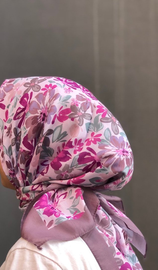 Pembe tonlarında pastel çiçek desenli, dökümlü tasarıma sahip, yumuşak sentetik kumaştan kadın eşarp.