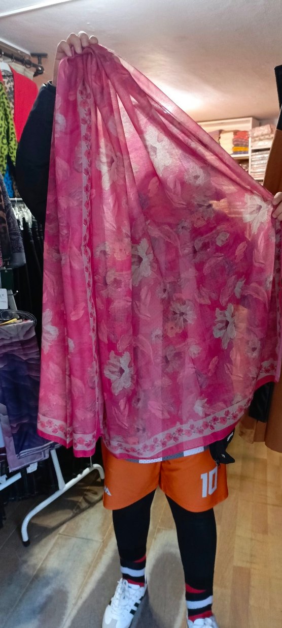 Pembe renkli, çiçek desenli, dökümlü bohem tarzı kadın şalı. Hafif sentetik kumaştan üretilmiştir.