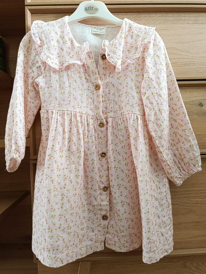 Pamuklu, düğmeli ve uzun kollu bol kesim kız elbisesi, yakalı ve pastel pembe renkli, bohem tarzıyla nostaljik bir görünüm sunar. Muslin kumaştır.Bir kaç kez giyilmiştir.