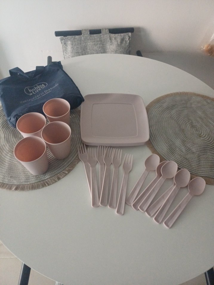 Pastel pembe bohem tarzı yemek takımı; bardaklar, çatallar, kaşıklar ve kare tabaktan oluşur. ️