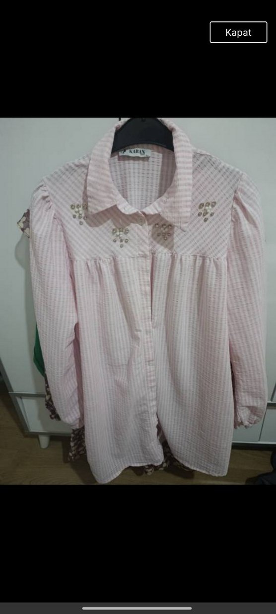 Pembe ayrobin kumaştan, uzun kollu, yakalı ve nakış detaylı, bol kesim vintage bohem tarzında gömlek.