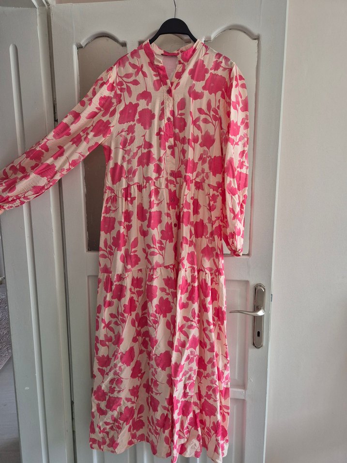 Yumuşak pamuktan yapılmış, uzun ve bol kesim bu elbise, yüksek yakalı ve uzun kolludur. Pembe batik deseni ve drapeli tasarımıyla bohem bir tarz sunar. 40 44 neden uyumlu