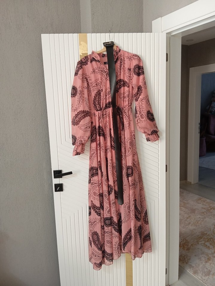 Pembe renkli, bol kesim, drapeli ve batik desenli uzun elbise. Halter yaka ve askılı kollara sahip, yumuşak sentetik kumaştan bohem tarzda.