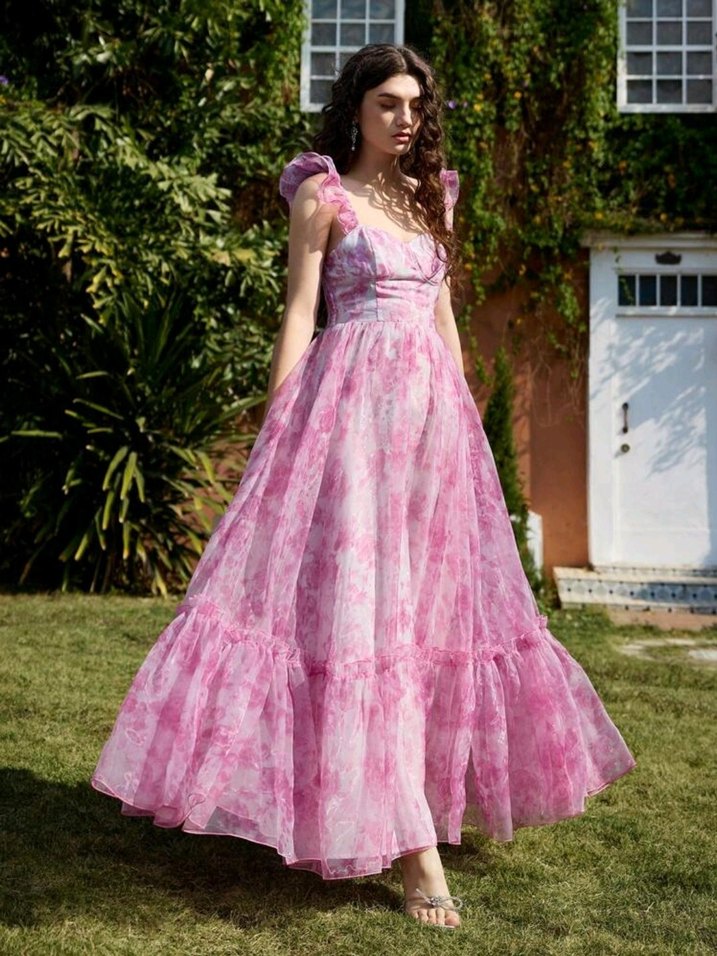 Pembe pastel tonlarda, bağlamalı desenli uzun elbise, fırfırlı detaylar ve askısız yakasıyla bohem tarzda, rahat bir kesime sahiptir.
