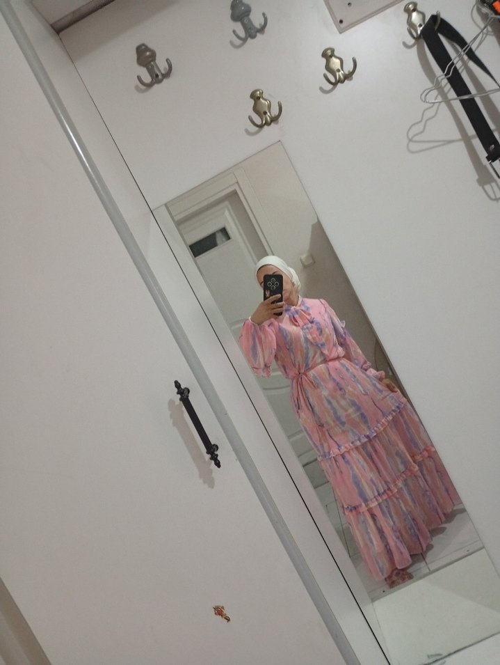 Pembe pastel tonlarda, bol kesim ve fırfır detaylı uzun elbise. ve yumuşak saten kumaştan bohem tarzda. fiyatta indirim sağlayabilirim..