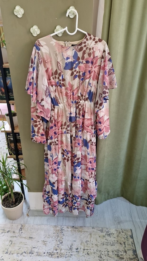 Pembe renkli bu uzun elbise, bol kesim ve drapeli tasarıma sahiptir. V yaka ve askılı kolludur, pastel çiçek desenlidir. Hafif sentetik kumaştan yapılmıştır. 40-42 beden için uygun belli lastikli yeni hiç giyilmedi sadece etiketi yok
