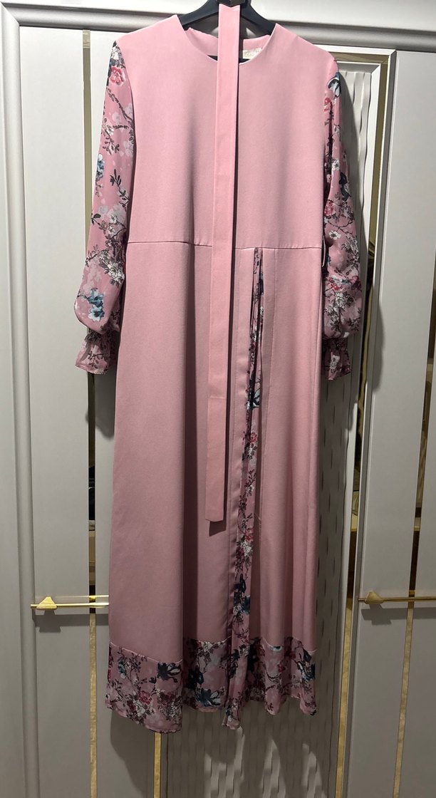 Pembe renkte, yüksek yakalı ve askılı kollu uzun elbise. Drapeli, pastel tonlarda baskılı ve düz sentetik kumaşla bohem tarzda.