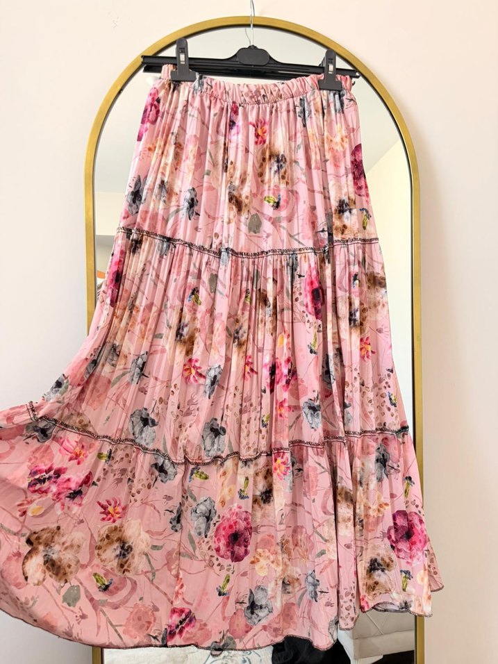 Pembe renkte, bol kesim, fırfırlı ve tie-dye çiçek desenli bohem uzun etek, yumuşak sentetik kumaştan üretilmiştir. Günlük kullanıma uygundur.