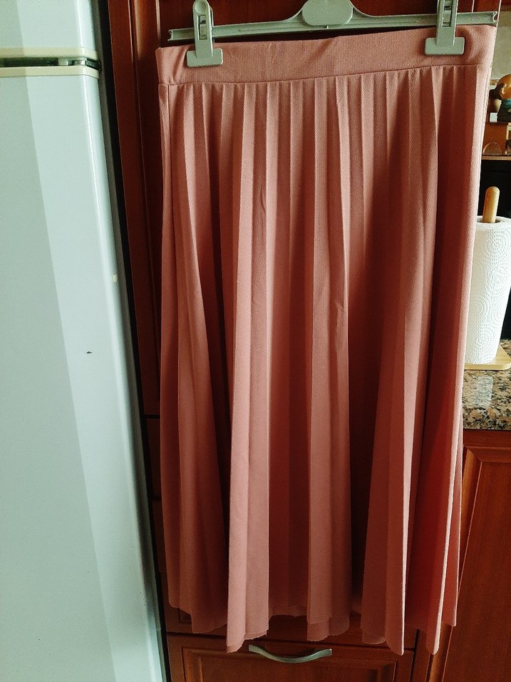 Pastel pembe, bohem tarzda uzun kadın eteği. Yumuşak kumaş ve akıcı tasarımıyla rahat ve şık bir görünüm sağlar.
