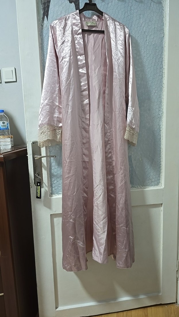 Bol kesim, uzun kollu pembe pastel renkte kadın sabahlık. Bohem tarzda, kollarında ince dantel detayları bulunur. Uzun boy ve desensizdir.