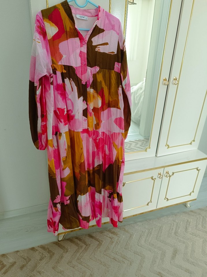 Pembe bohem tarzda uzun kol, V yakalı, dökümlü ve pastel bağlama desenli bol kesim elbise. Yumuşak sentetik kumaştan üretilmiştir.