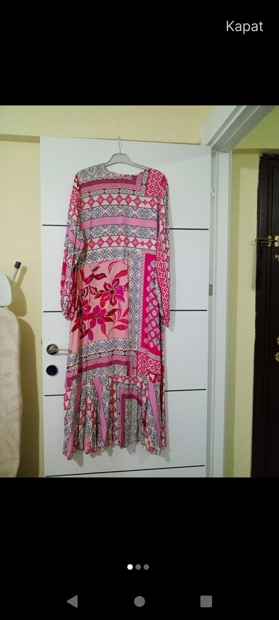Pembe, uzun kollu, bol kesim bohem elbise. Fırfır detaylı ve tekne yakalı, pastel tonlarda batik desenli. hangini isterseniz viskon kumas