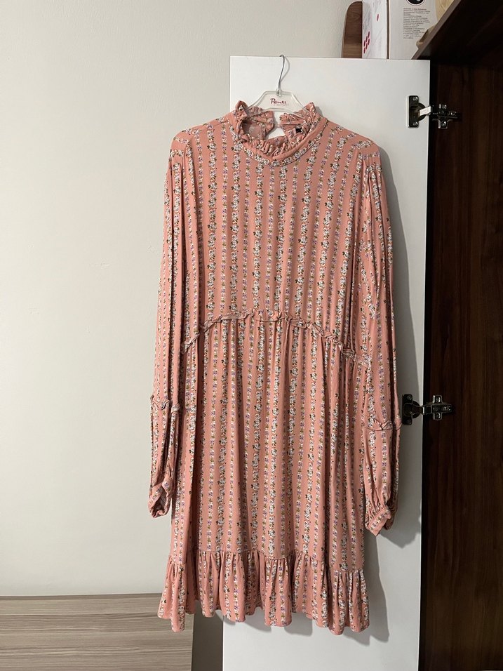 Pembe bohem tarzda, yüksek yakalı, uzun kollu ve bol kesim elbise. Fırfır detayları ve yumuşak dokulu kumaşıyla günlük kullanıma uygundur.