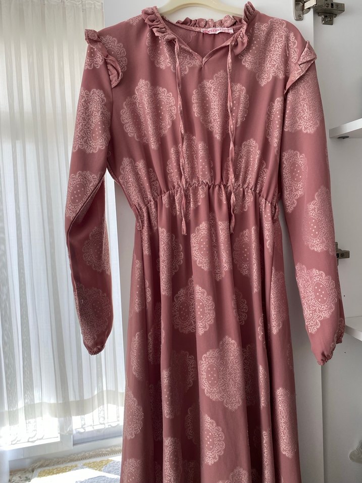 Pembe uzun, bol kesim elbise; uzun kollu, V yaka ve fırfır detaylı. Sentetik kumaştan, pastel tonlarda batik desenlidir. Biraz tüylenme mevcut 44 beden yazıyor ama 42 beden uyumlu