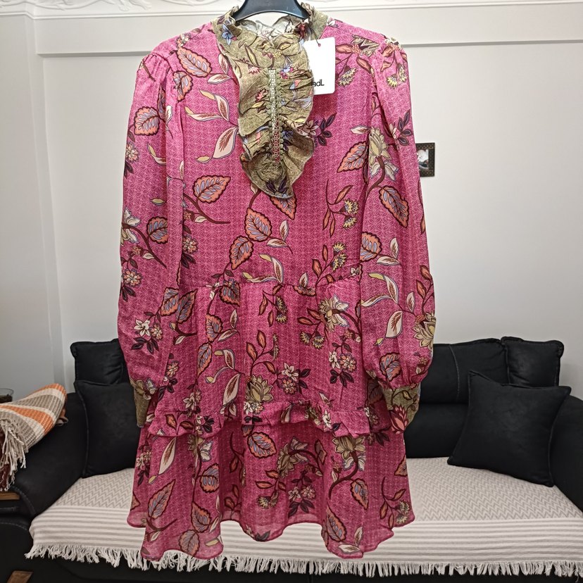 Pembe Bohem Uzun Kollu Fırfırlı elbise