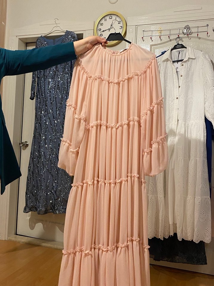 Pembe pastel renkte, uzun kollu ve fırfırlı, bol kesim bohem tarzda uzun elbise. Yumuşak sentetik kumaştan yapılmıştır, günlük kullanıma uygundur.
