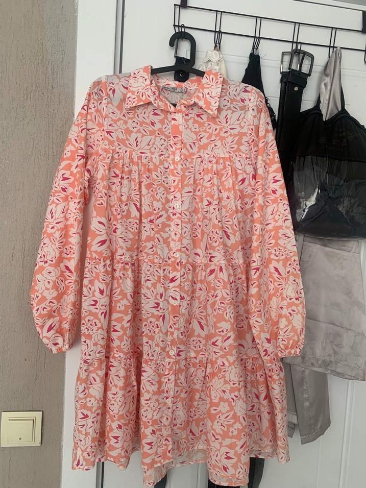 Bol kesim, uzun kollu, yakalı ve düğmeli hamile bluzu. Pastel pembe tie-dye desenli, bohem tarzda, günlük kullanıma uygun. Normal tunik olarak kullanabilirsiniz ben öyle kullanıyordum