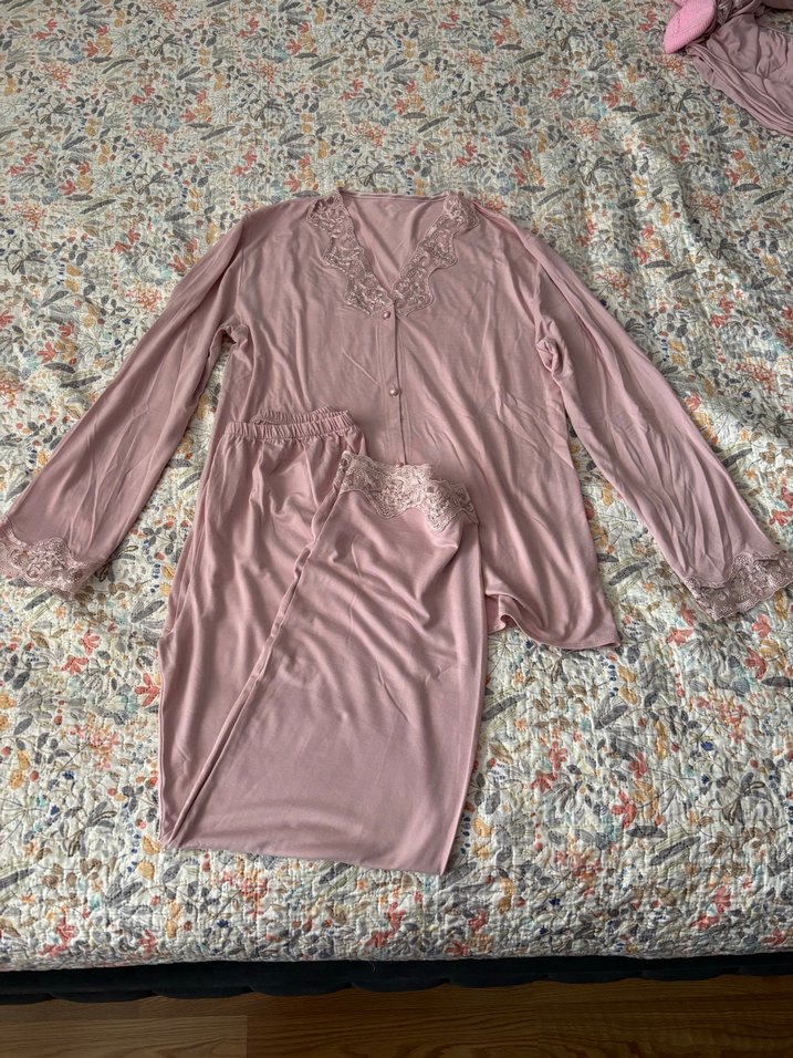 Pembe, uzun kollu ve bol kesim kadın pijama takımı, dantel detaylarıyla bohem ve rahat bir stil sunar. 6 parça çeyiz seti olarak alınmıştır bedeni olmadığı için giyilmedi . Sitare mağazasından alınmıştı