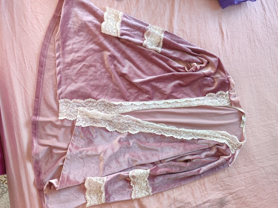 Pembe renkte, uzun ve bol kesim sabahlık. İnce askılı kollarda ve kenarlarda dantel süslemeler bulunur. Yumuşak dokulu, bohem tarzda rahat bir model.