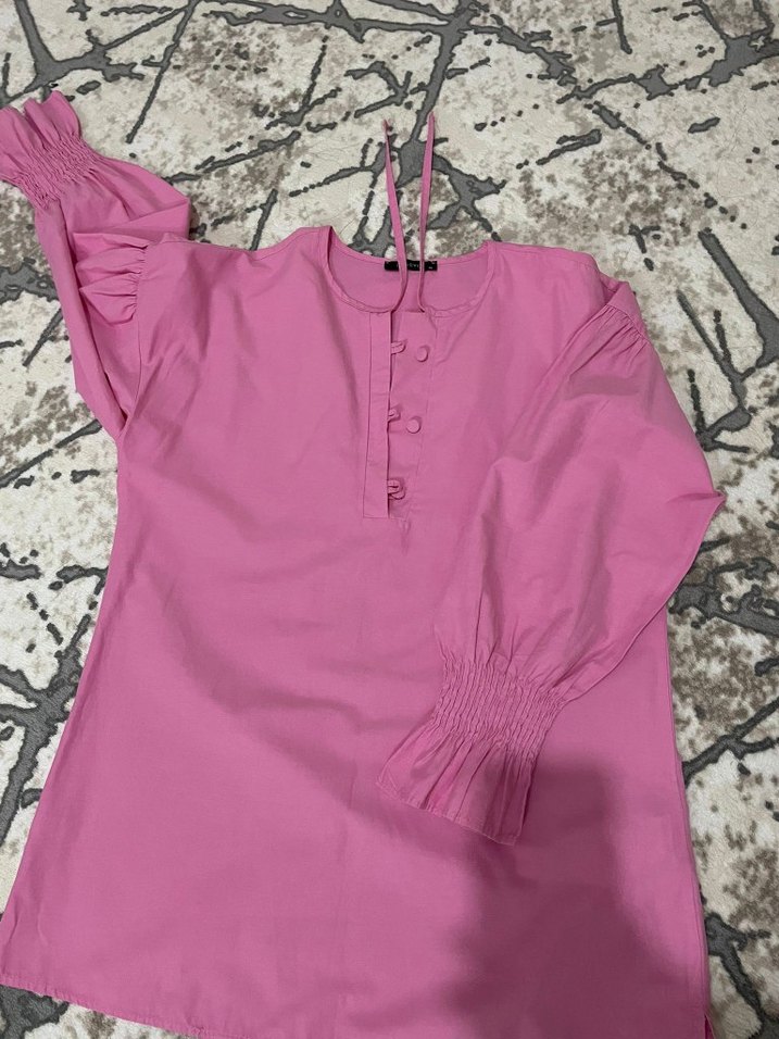 Yumuşak pamuklu, düğmeli V yakalı, bol kesim pembe kız bluzu. Uzun kollu ve pastel tonlarda, bohem stil için uygundur.