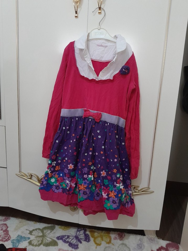 Renkli bohem kız elbisesi, uzun kollu ve yakalıdır. Fırfırlı detaylar ve bağcıklı, çiçekli tie-dye desenli rahat kesim bir modeldir.