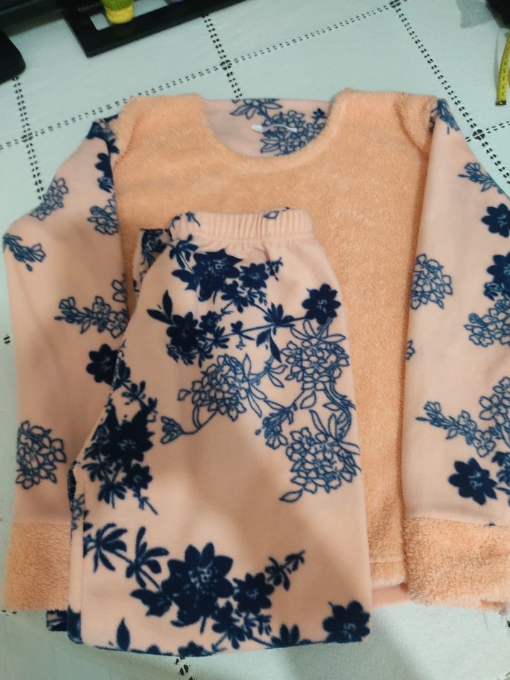 Yumuşak dokulu, bol kesim uzun kollu ve kısa boy pembe bohem ev giyimi seti, koyu renk çiçek baskılarıyla dikkat çekiyor. 1.50 boy için uygundur