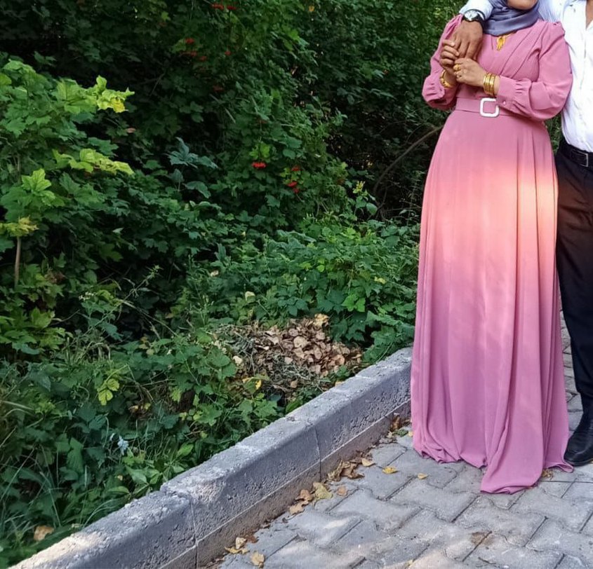 Pembe pastel renkte, bol kesim ve drapeli ipeksi kumaştan bohem elbise. Tekne yaka ve uzun kollu, mütevazı tarzda, düğünlere uygun.