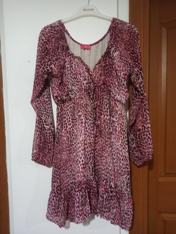 Bu bohem tarz tunik, uzun kollu, V yaka ve salaş kesim olup fırfır detaylara sahiptir. Koyu pembe batik desenli, midi boy ve sentetik kumaştan yapılmıştır.