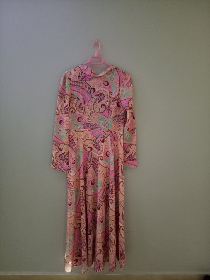 Pembe tonlarda pastel batik desenli, uzun kollu, V yaka ve bol kesim bohem tarzda uzun elbisedir. Yumuşak sentetik kumaştan günlük kullanıma uygundur.