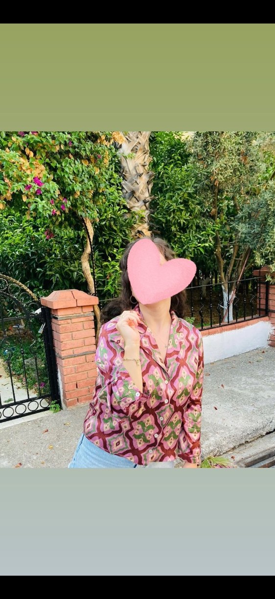 Pembe pastel tonlarda, bağlama desenli, V yakalı ve midi boyda bol kesim uzun kollu gömlek. Sadece bir kere giydim dar geldiği için satıyorum